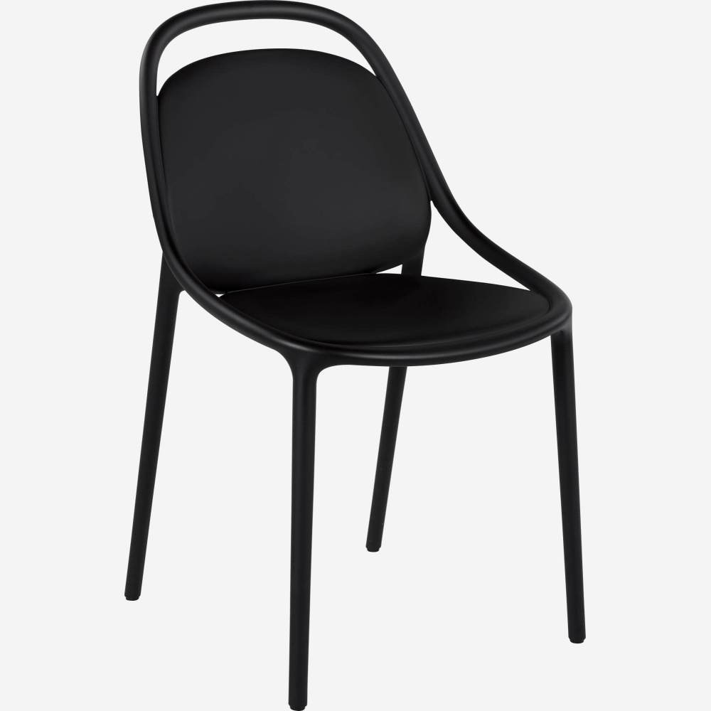 Crafted with precision and style, this sophisticated cafe chair in black plastic was designed for comfort and durability. Made from a seamless blend of polypropylene and fiberglass, it boasts a stackable design that optimizes space usage without compromising on elegance. Enhance your cafe or patio with this timeless piece that effortlessly combines functionality with a sleek aesthetic.