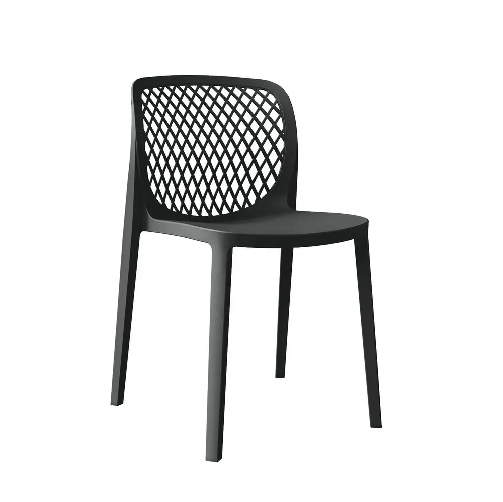 Crafted from elegant black-colored polypropylene, this sophisticated restaurant chair combines style and functionality. Designed for stackability, it effortlessly saves space in any dining area, be it a cozy kitchen or a bustling cafe. Its versatility extends beyond indoor settings, as it is durable enough to grace outdoor spaces with enduring charm. Experience the perfect balance of comfort and chic design with this stylish addition to any establishment.