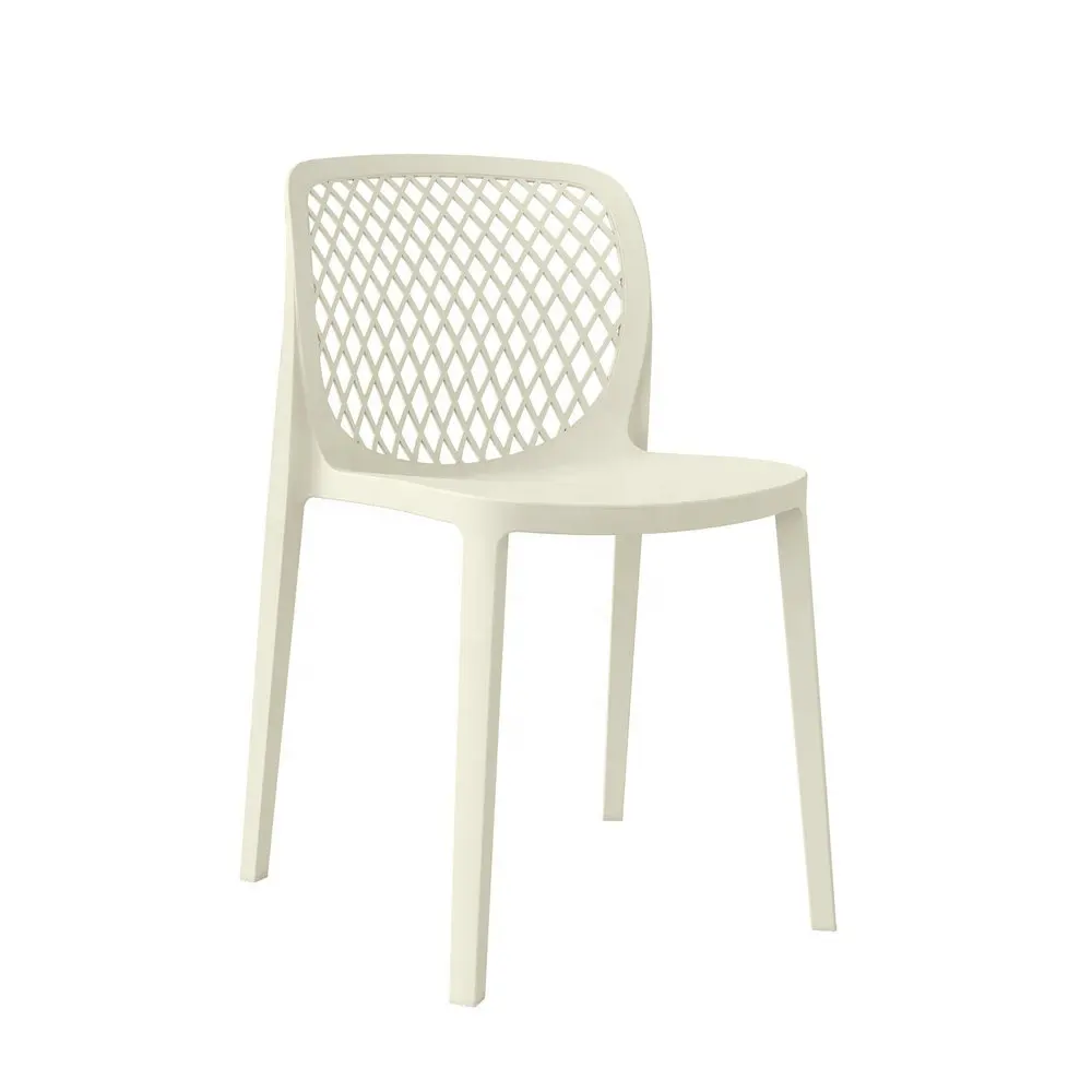 Crafted from elegant cream-colored polypropylene, this sophisticated restaurant chair combines style and functionality. Designed for stackability, it effortlessly saves space in any dining area, be it a cozy kitchen or a bustling cafe. Its versatility extends beyond indoor settings, as it is durable enough to grace outdoor spaces with enduring charm. Experience the perfect balance of comfort and chic design with this stylish addition to any establishment.
