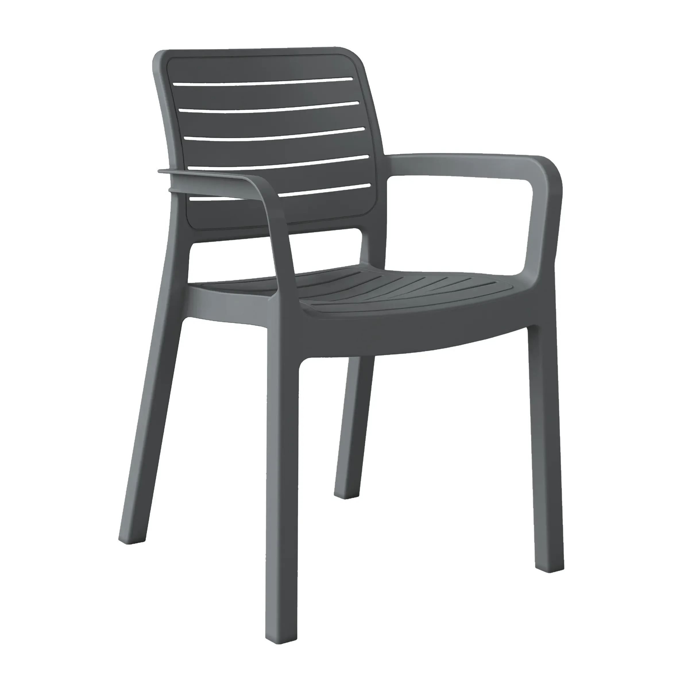 Enhance your outdoor space with our sleek Dark Grey Plastic Garden Chair. Featuring armrests and made with stackable polypropylene and fiberglass materials, this stylish and durable chair is perfect for any patio or garden setting.