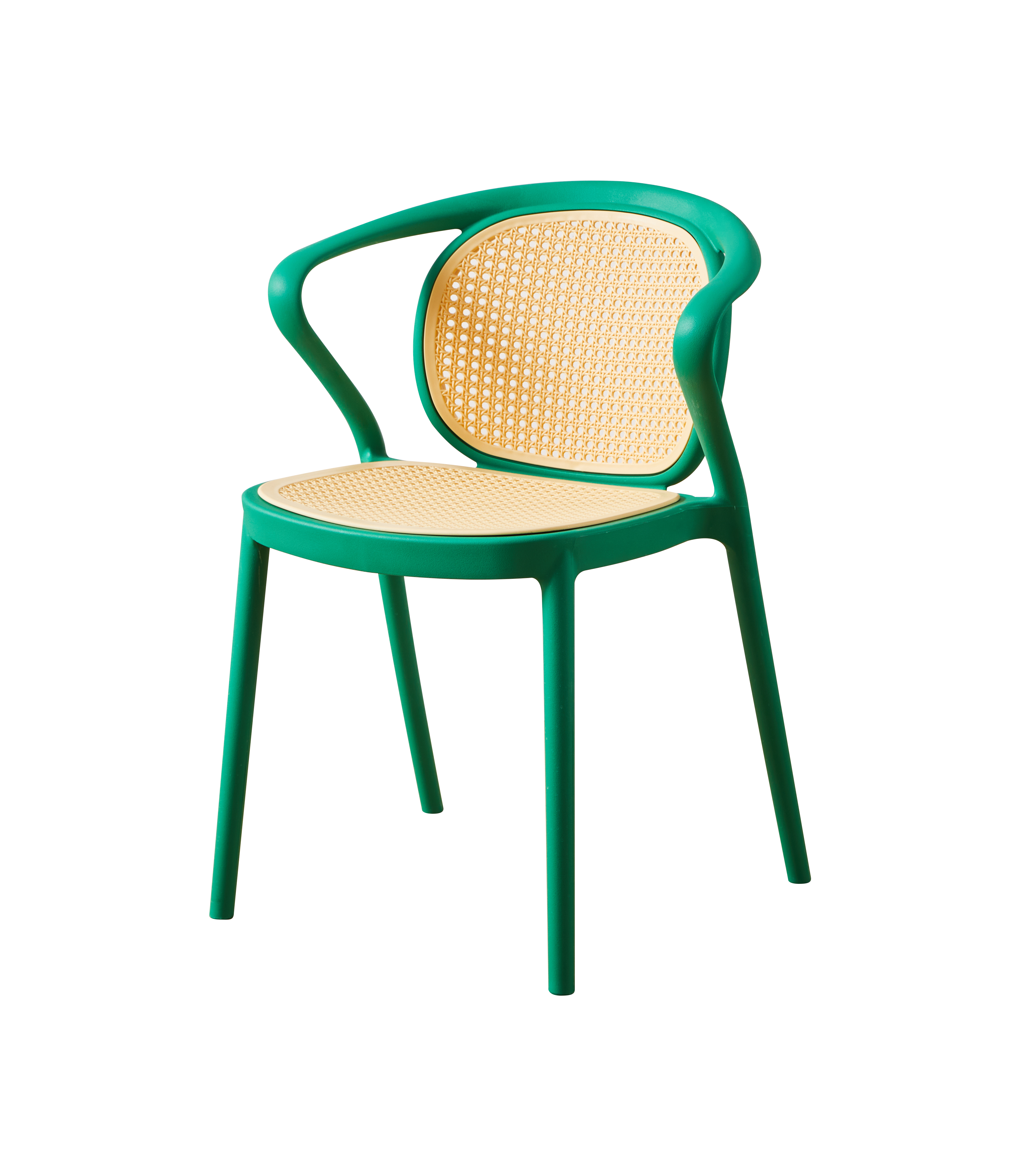 The Green Polypropylene Armchair is a stylish addition to your dining, kitchen, cafe, or restaurant. Its stackable design allows for easy storage. The beige back and seat offer a comfortable seating experience, while the green frame adds a touch of modernity. With its hollow out design, it's perfect for both indoor and outdoor use.