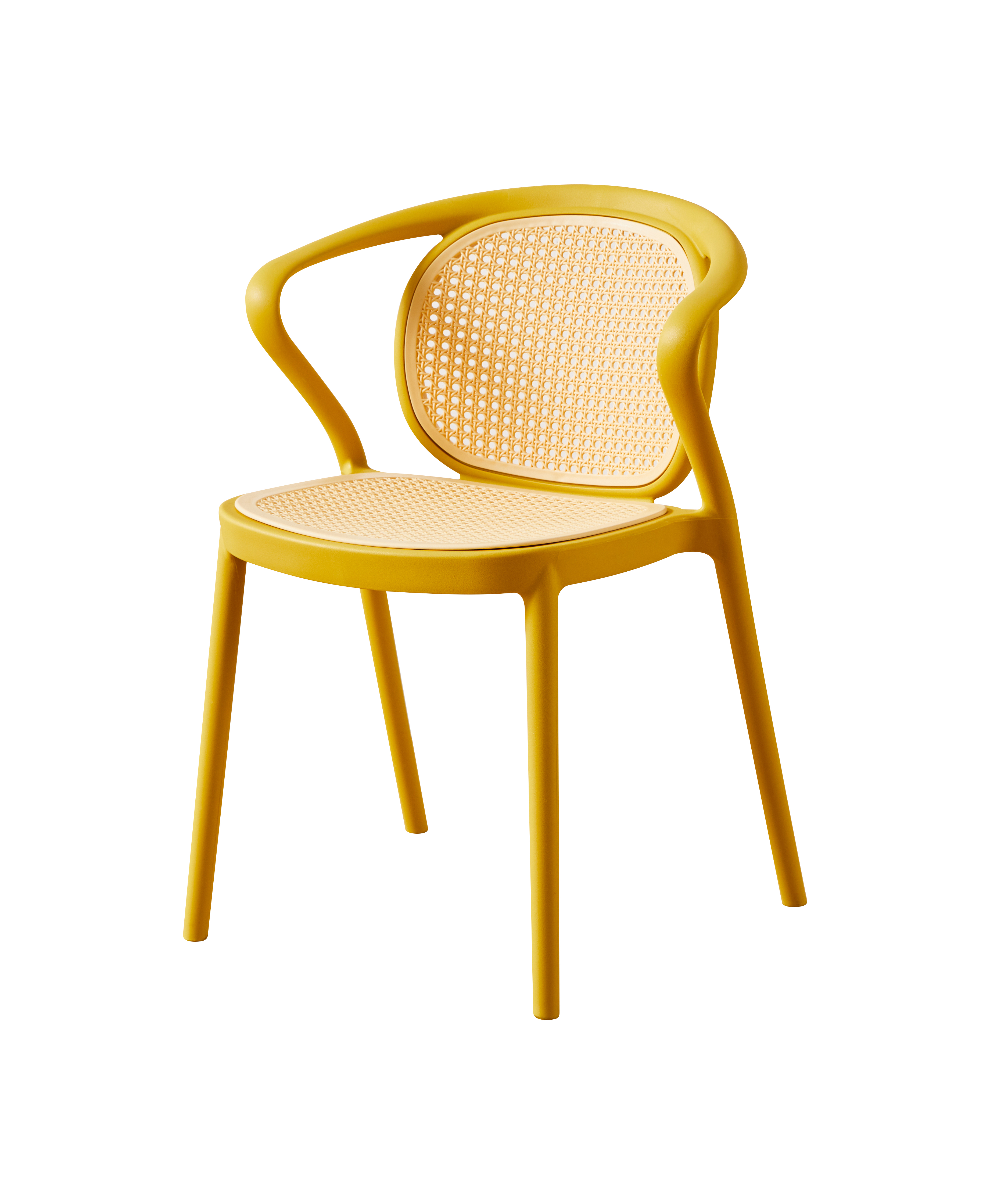 The Mustard Polypropylene Armchair is a stylish addition to your dining, kitchen, cafe, or restaurant. Its stackable design allows for easy storage. The beige back and seat offer a comfortable seating experience, while the mustard frame adds a touch of modernity. With its hollow out design, it's perfect for both indoor and outdoor use.