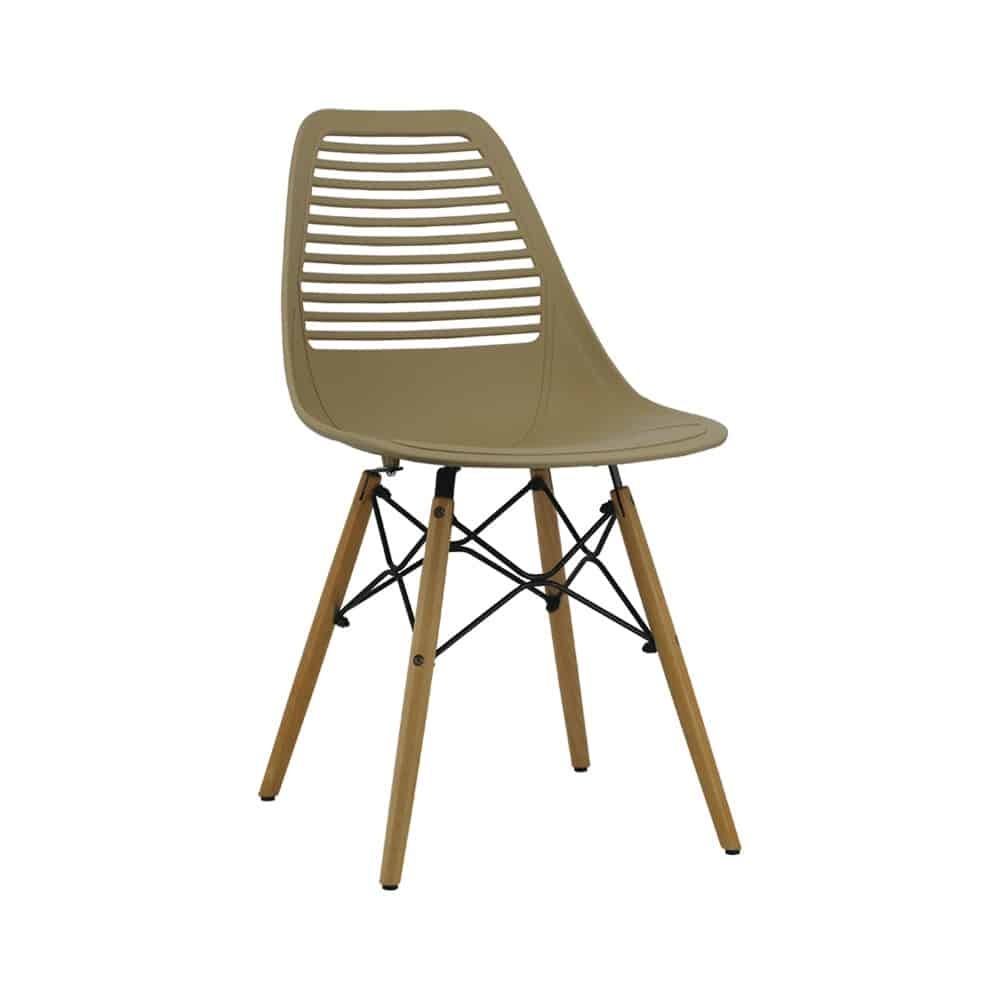 This contemporary armless dining chair combines a warm taupe polypropylene seat with natural beechwood legs for understated elegance. The durable plastic seat resists stains and scratches while the solid beechwood frame provides sturdy support up to 250 lbs. Perfect for modern dining rooms, kitchens, and cafes, this chair features tool-free assembly and easy maintenance. The neutral taupe color complements both warm and cool color schemes.