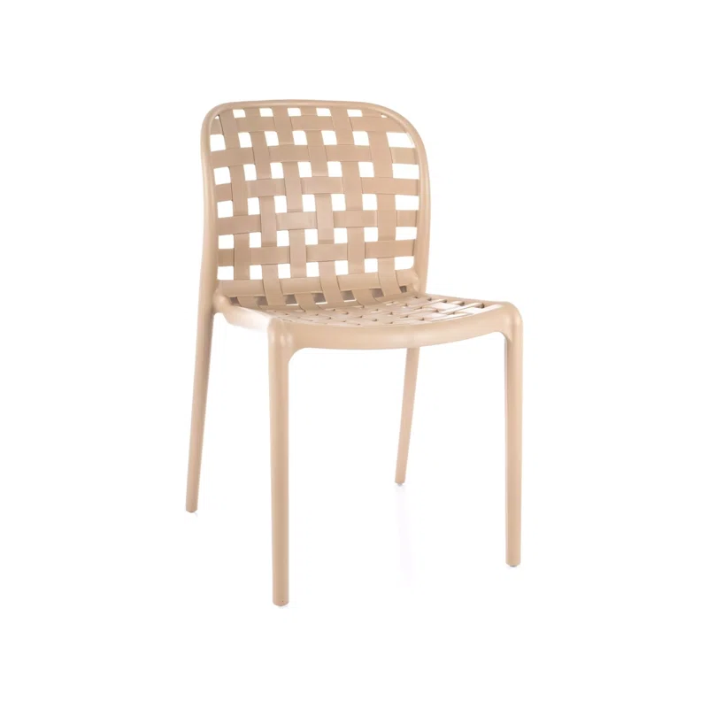 Exuding modern elegance, this stackable side chair embodies sleek sophistication. Crafted with taupe polypropylene, it seamlessly blends durability and style. Perfect for dining spaces, kitchens, cafes, restaurants, or outdoor gardens, this chair's versatility knows no bounds. Elevate your surroundings with this timeless statement piece and relish in its refined allure.