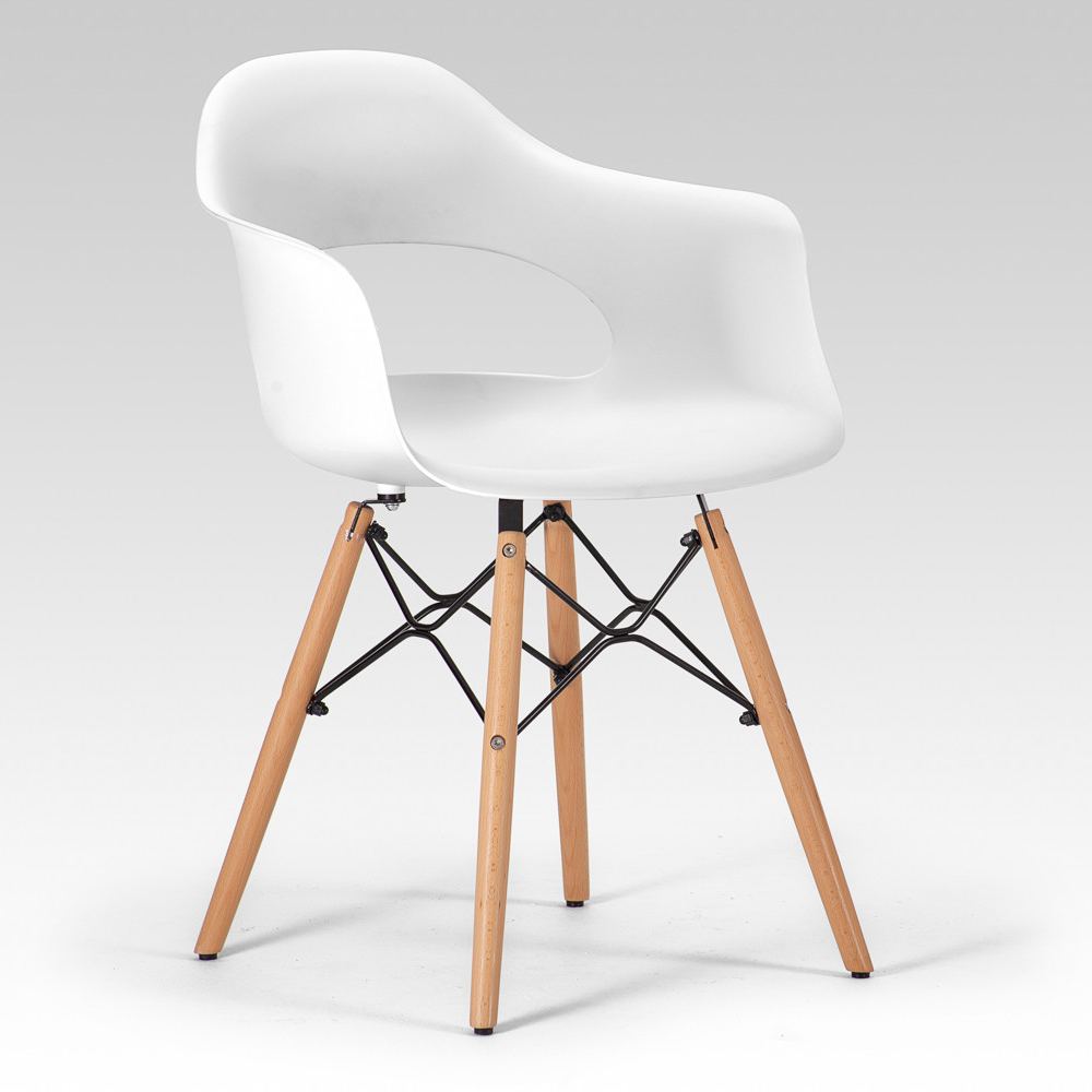 Scandinavian-Inspired Armchair – This elegant chair combines a crisp white polypropylene seat with natural beech wood legs, blending minimalist design with organic warmth. Perfect for modern interiors with 300lb weight capacity.
