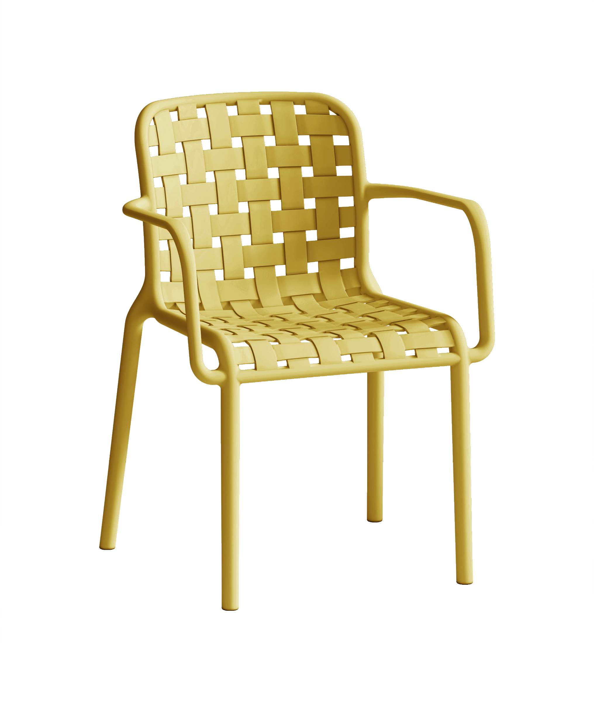 This vibrant yellow stackable armchair features a ventilated plastic backrest for optimal airflow and all-day comfort. Made from UV-resistant polypropylene, it withstands sun exposure, rain, and temperature changes while maintaining its cheerful color. The armrests provide extra support, and the stackable design saves 65% storage space. With a 150kg weight capacity and anti-slip feet, this chair is perfect for patios, pool decks, cafes, and outdoor events.